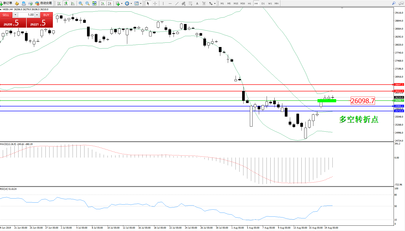 香港恒生指数820日(周二)收盘下跌60.30点,跌幅0.23%,报26231.54点;恒指 早上跟外围造好而高开260点。随后再扩大升幅至最多升504点,恒指重上26000关口,高见26239。市场对全球经济衰退的担忧依然占据主流。美债收益率倒挂,全球央行未来或继续降息、降息甚至重启量化宽松政策,都使得市场负面情绪升温。市场憧憬美联储下月将再次降息,或为挽救经济退出宽松货币政策。近期恒指累跌不少,外围以及本地因素仍然难测。过去两个月的连串事件,已令大部分投资者对后市看法变得相当审慎。
