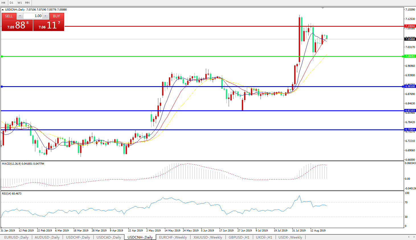 备选策略: 在7.0000之下,看跌,目标价位为6.9010,然后为6.8210。