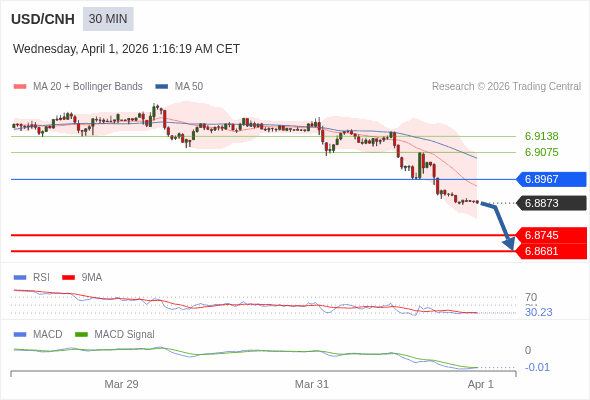 美元/人民币 当日内 : 看跌,在 6.8967 之下。