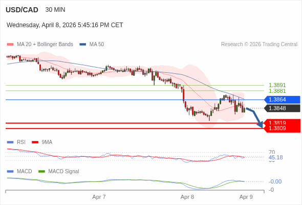 美元/加元 当日内 : 看跌,在 1.3864 之下。