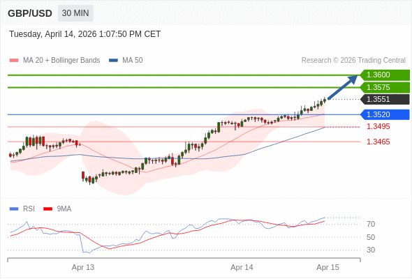 在 1.3520 之上,看涨,目标价位为 1.3575 ,然后为 1.3600 。