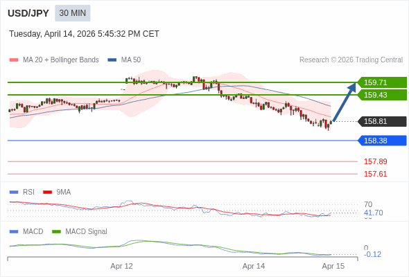 美元/日元 当日内 : 有上涨的可能,目标价位定在 159.71 。
