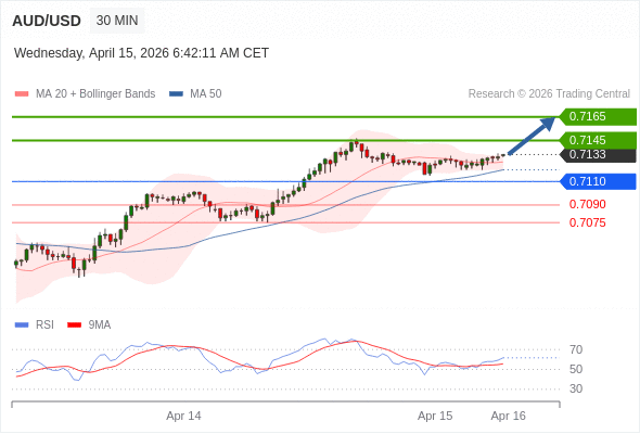 在 0.7110 之上,看涨,目标价位为 0.7145 ,然后为 0.7165 。