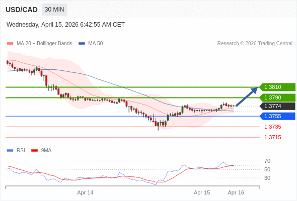 在 1.3755 之上,看涨,目标价位为 1.3790 ,然后为 1.3810 。