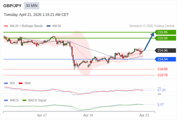 英镑/日元 当日内 : 看涨,当 214.54 为支撑位,目标定在215.85。