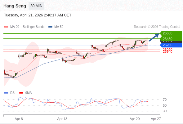在 26200 之上,看涨,目标价位为 26450 ,然后为 26660 。