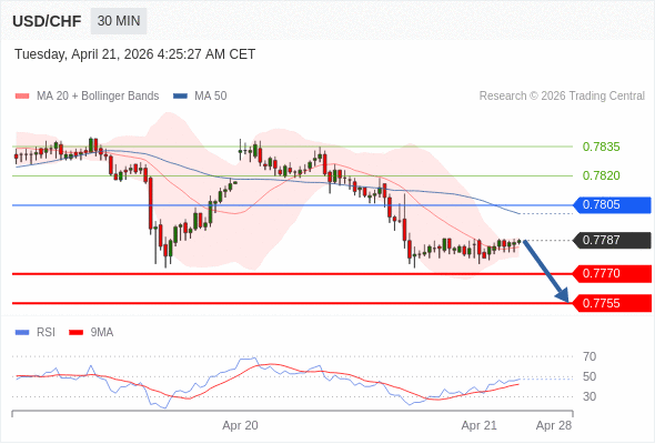 在 0.7805 之下,看跌,目标价位为 0.7770 ,然后为 0.7755 。