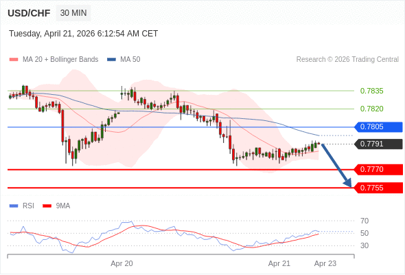 在 0.7805 之下,看跌,目标价位为 0.7770 ,然后为 0.7755 。