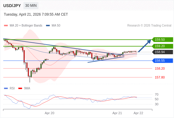 在 158.55 之上,看涨,目标价位为 159.20 ,然后为 159.50 。