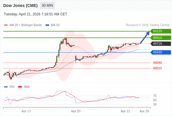 在 49430 之上,看涨,目标价位为 49910 ,然后为 50125 。