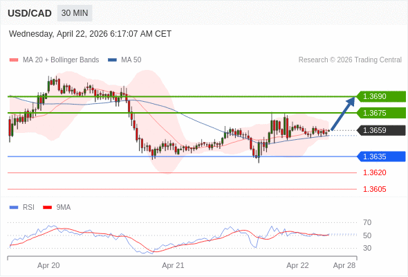 在 1.3635 之上,看涨,目标价位为 1.3675 ,然后为 1.3690 。