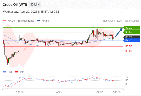 在 87.70 之上,看涨,目标价位为 90.60 ,然后为 92.20 。
