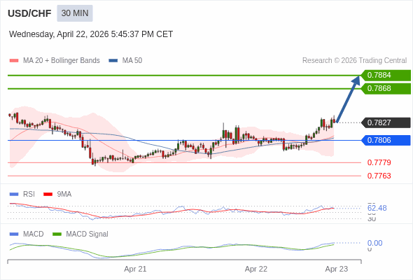 美元/瑞郎 当日内 : 看涨,当 0.7806 为支撑位。