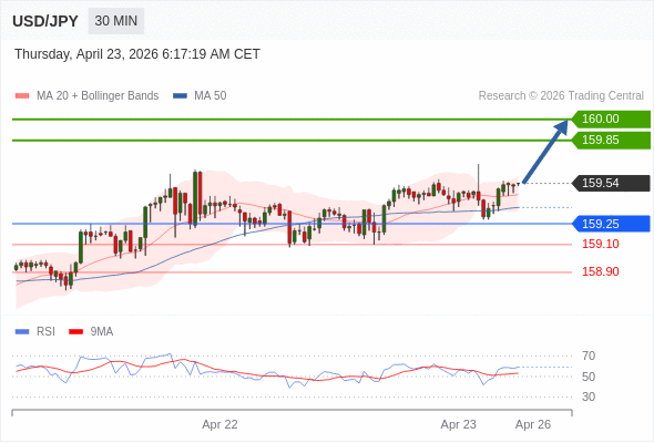 在 159.25 之上,看涨,目标价位为 159.85 ,然后为 160.00 。
