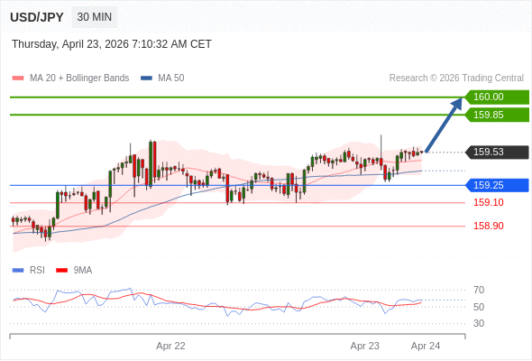 在 159.25 之上,看涨,目标价位为 159.85 ,然后为 160.00 。
