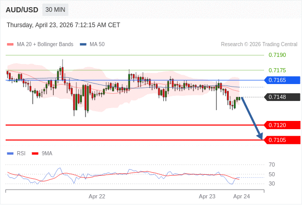 在 0.7165 之下,看跌,目标价位为 0.7120 ,然后为 0.7105 。