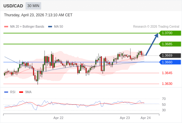 在 1.3660 之上,看涨,目标价位为 1.3685 ,然后为 1.3700 。