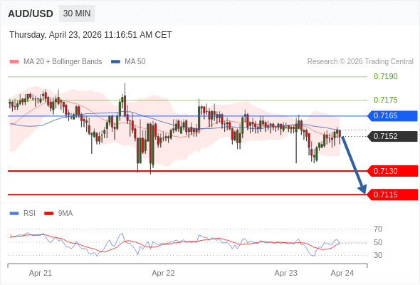 在 0.7165 之下,看跌,目标价位为 0.7130 ,然后为 0.7115 。