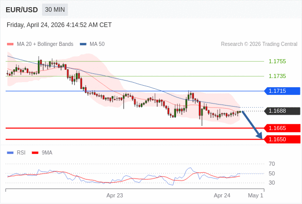 欧元/美元 当日内: 短期关键阻力位在1.1715。
