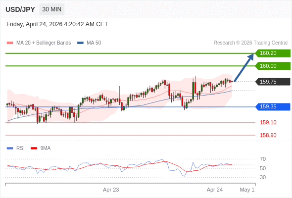 在 159.35 之上,看涨,目标价位为 160.00 ,然后为 160.20 。