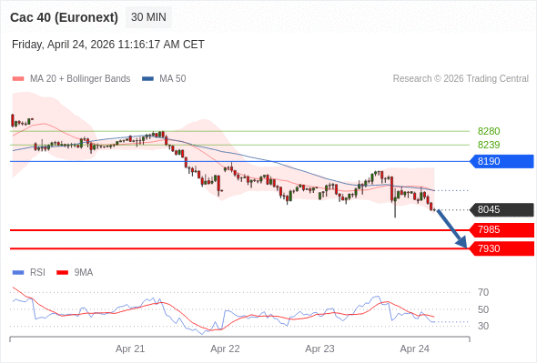 法国CAC指数期货 (Euronext) (K6) 当日内: 下跌趋势。