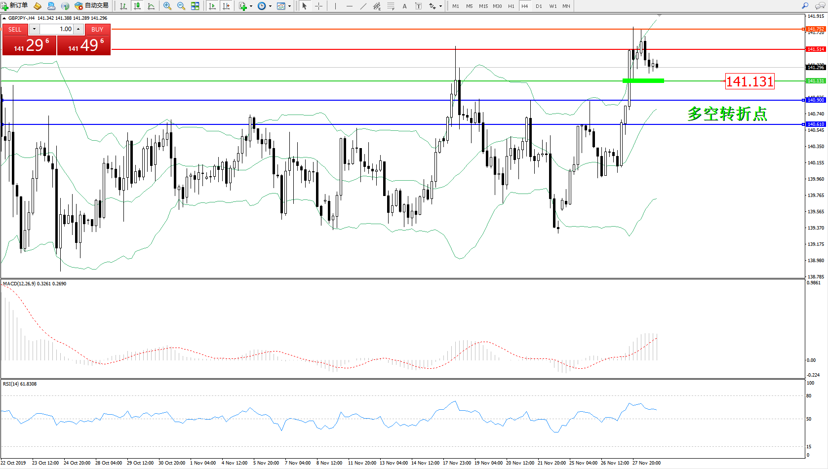 交易策略:141.131上方看涨,目标141.514、141.752