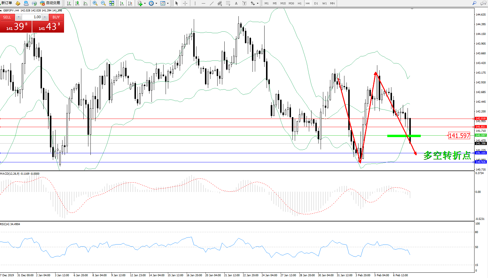 交易策略:141.597下方看跌,目标141.155、140.926