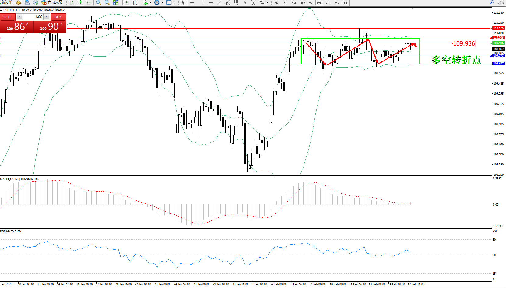 交易策略:109.936下方看跌,目标109.777、109.677