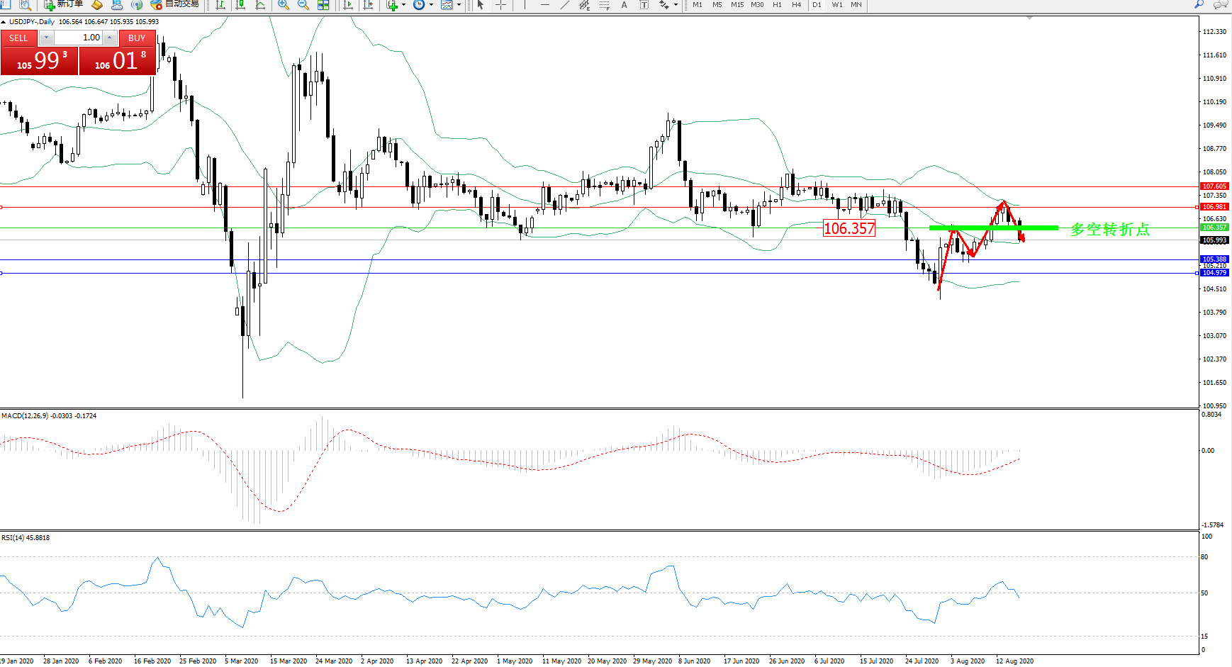 技术点评:低位多头动力维持震荡呈阶梯式震荡上移,高位抵达布林带指标上轨附近后遇阻出现回撤下移走势,布林带指标呈收口走势后开始有反转态势,关注中上轨区间转折点,多头动力相继减弱空头动力强势入场,下移至布林带指标中轨附近节点,MACD指标低位多头动力维持弱势震荡抵达0轴线,RSI指标低位多头动力维持震荡上移至50均衡线上方后再度回撤下移;