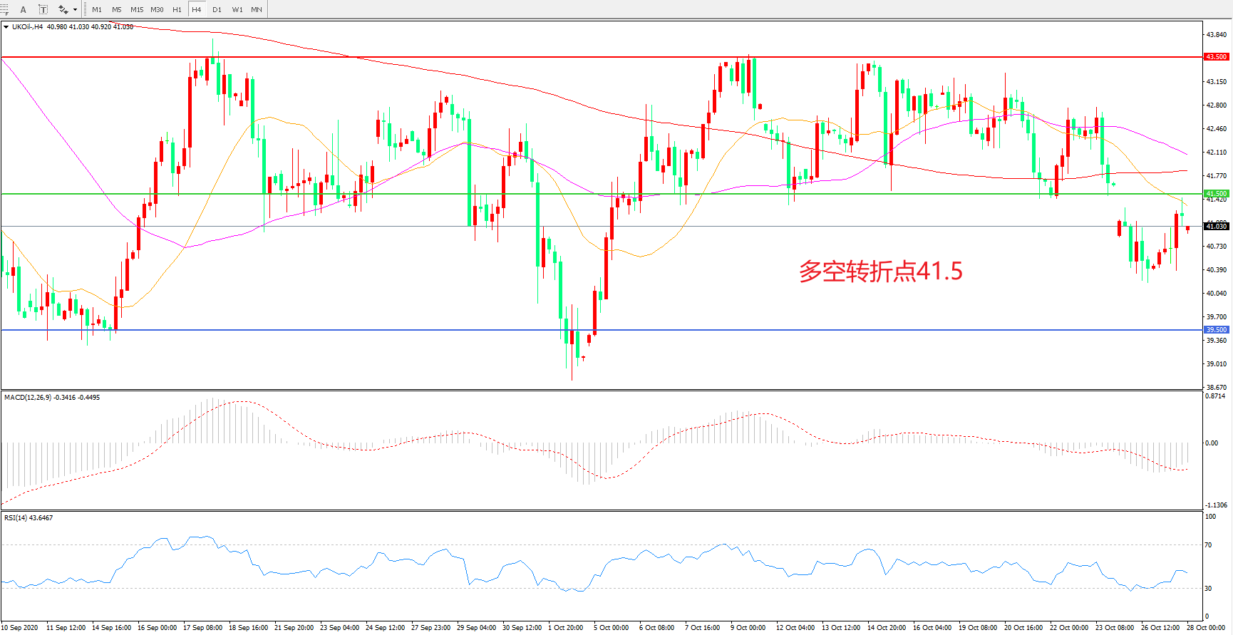 4小时图看,油价冲高回落,41.5成为明显阻力,箱体震荡下沿被跌破后无力收复,整体表现依旧疲软,MACD绿柱增加,RSI指标向下,日内延续下行概率较大。