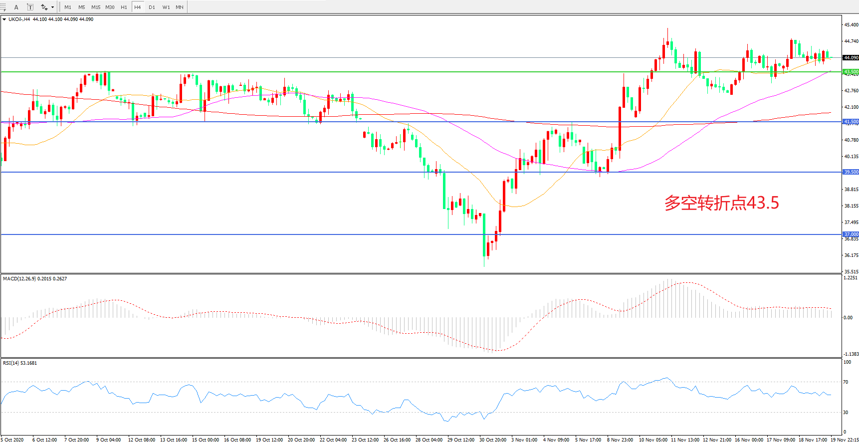 周四(11月19日),由于全球主要国家新冠疫情复燃且病例激增,重新引发市场对原油需求前景的担忧,油价维持窄幅震荡,布伦特原油小幅反弹,收报44.09美元/桶。近期迅猛增产的利比亚国家石油公司与法国道达尔石油讨论了前者的增产努力,供求不平衡可能再度令OPEC+在月底会议上推迟明年1月初执行的增产计划。