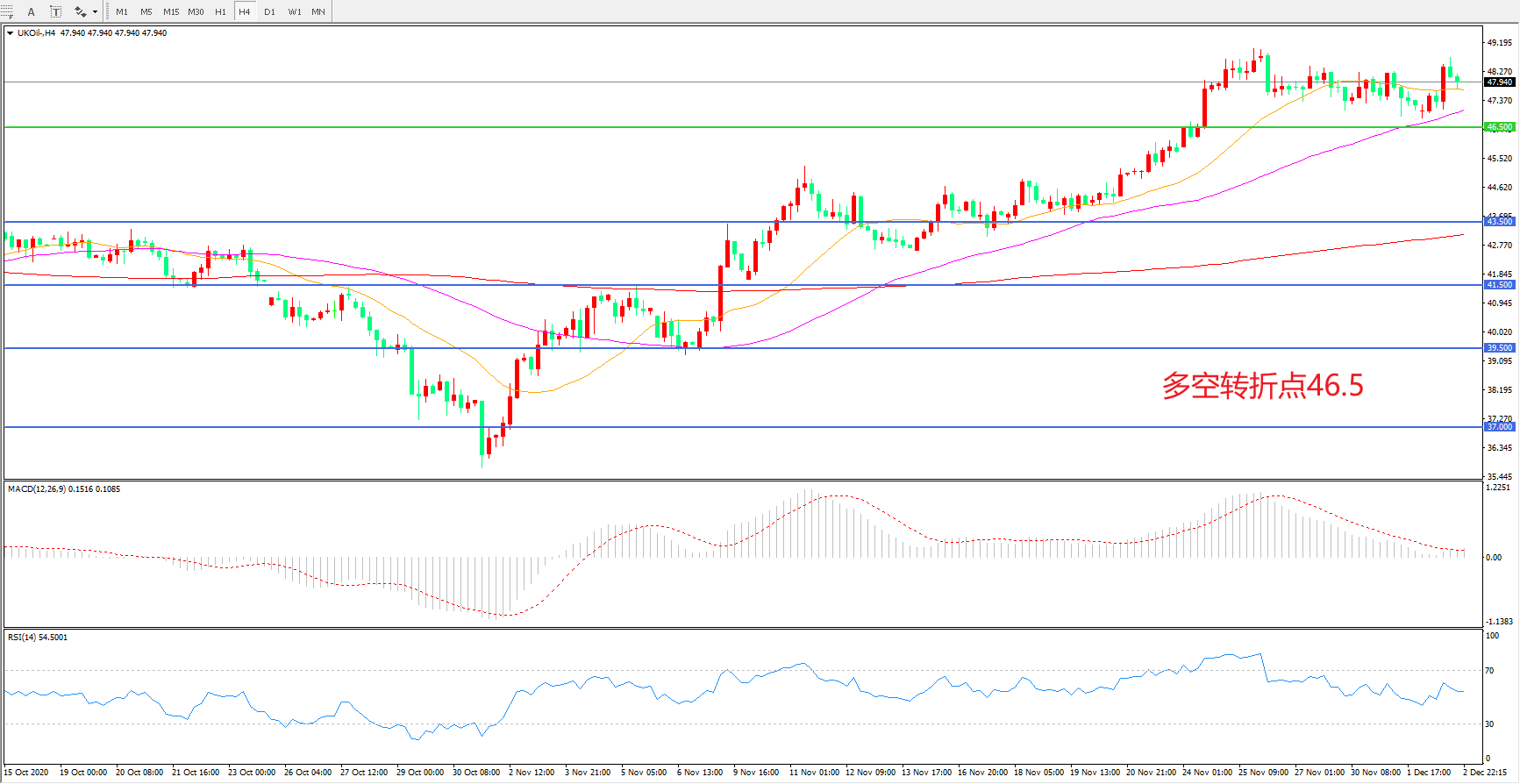 交易策略:  在46.50之上看涨,目标50.00      53.00