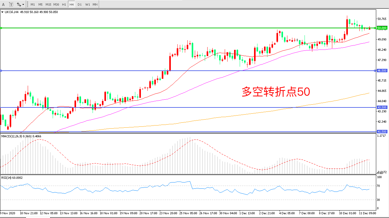 4小时图看,油价长阳突破后出现小幅回调,短期波幅不大,均线系统成为短期支撑,50美元成为多空分水岭,MACD红柱减少,RSI指标走平,日内延续震荡概率较大。