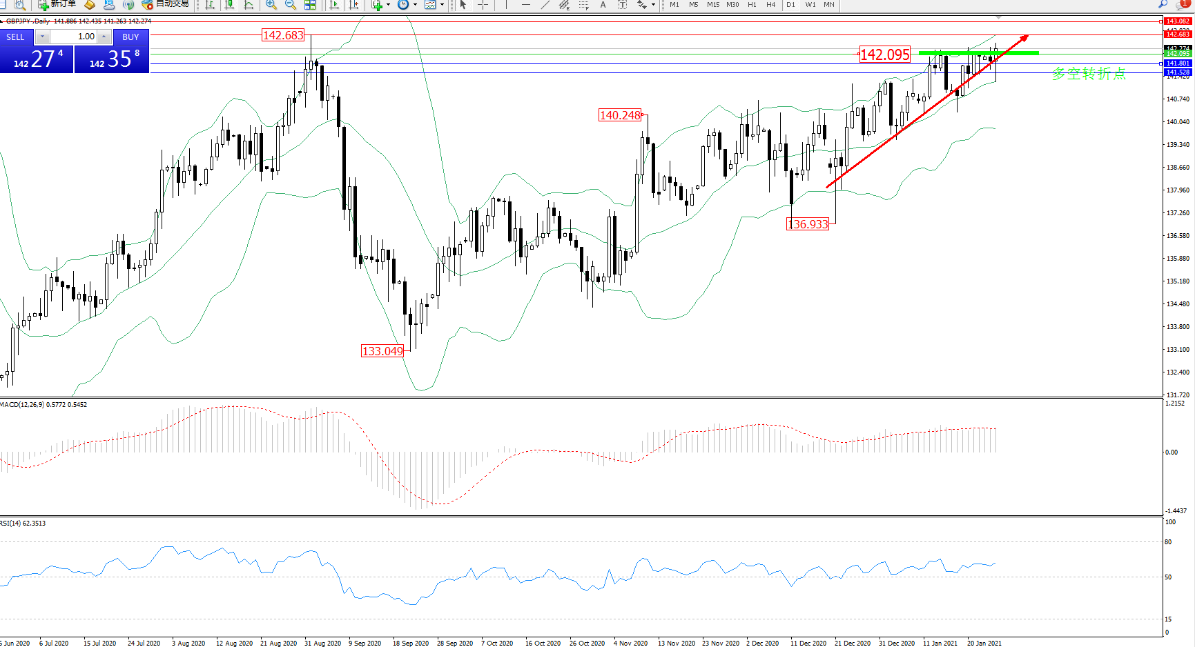交易策略:142.095上方看涨,目标142.683、143.082