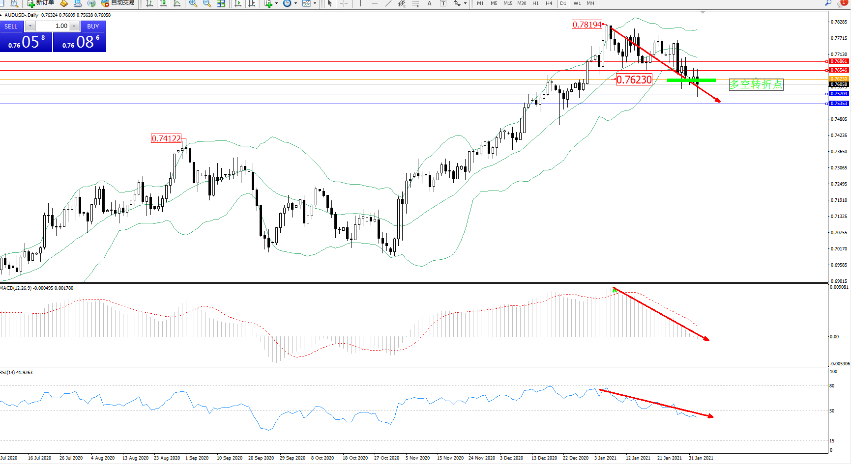 交易策略:0.76230下方看跌,目标0.75704、0.75353