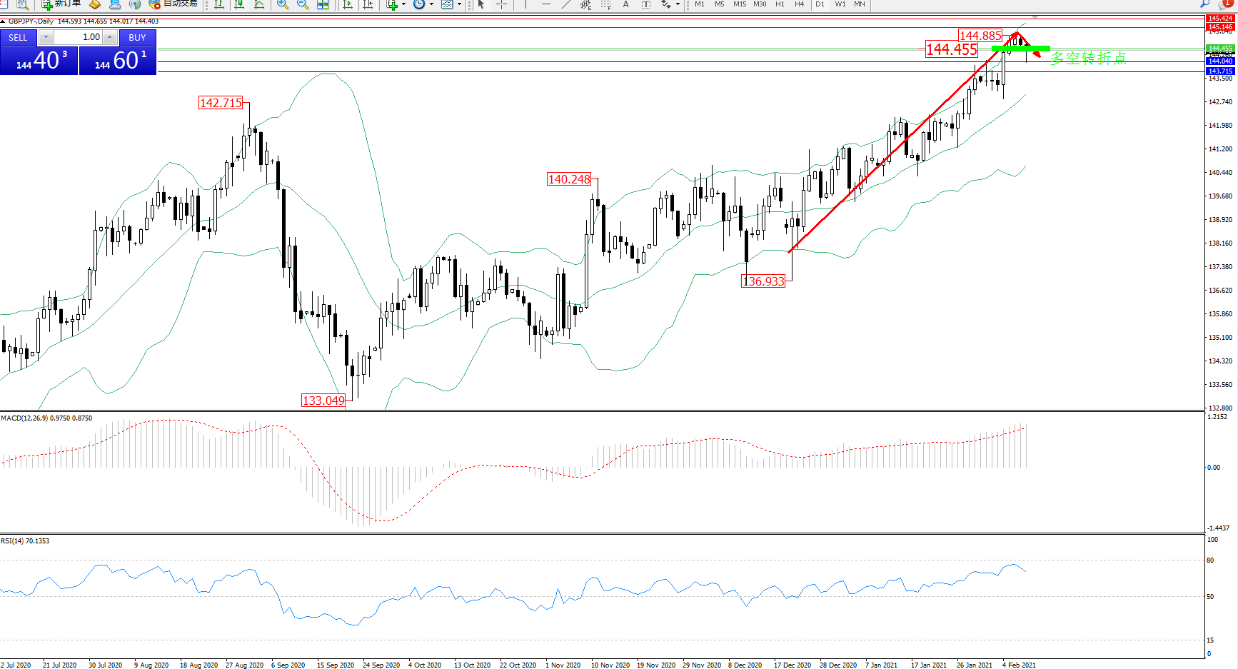 技术点评:多头动力延续布林带指标通道中上轨区间持续震荡上扬,高位抵达144.885附近节点后维持短暂整理有下行迹象,布林带指标呈上行走势后有收口迹象,MACD指标处于多头区域平缓向上移动态势良好,RSI指标处于多头区域维持整理上行后有平缓下行迹象;’