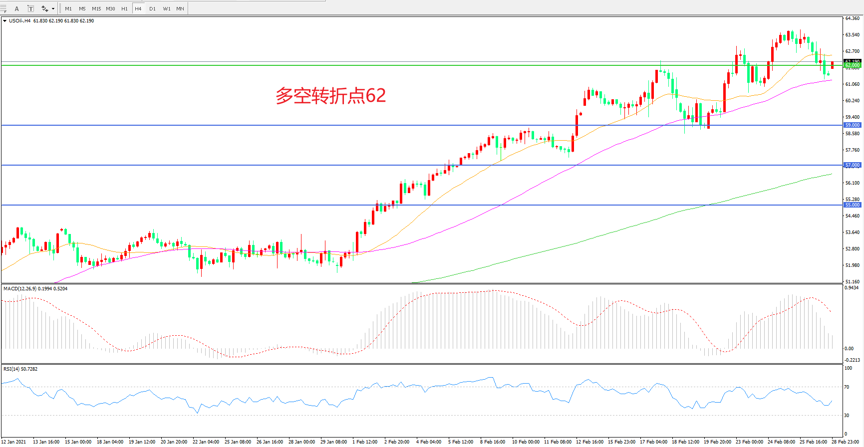 4小时图看,油价延续高位震荡,上行趋势较为稳健,62美元成为多空分水岭,55周期均线成为下方支撑,MACD红柱缩短,RSI指标走平,日内延续震荡概率较大。