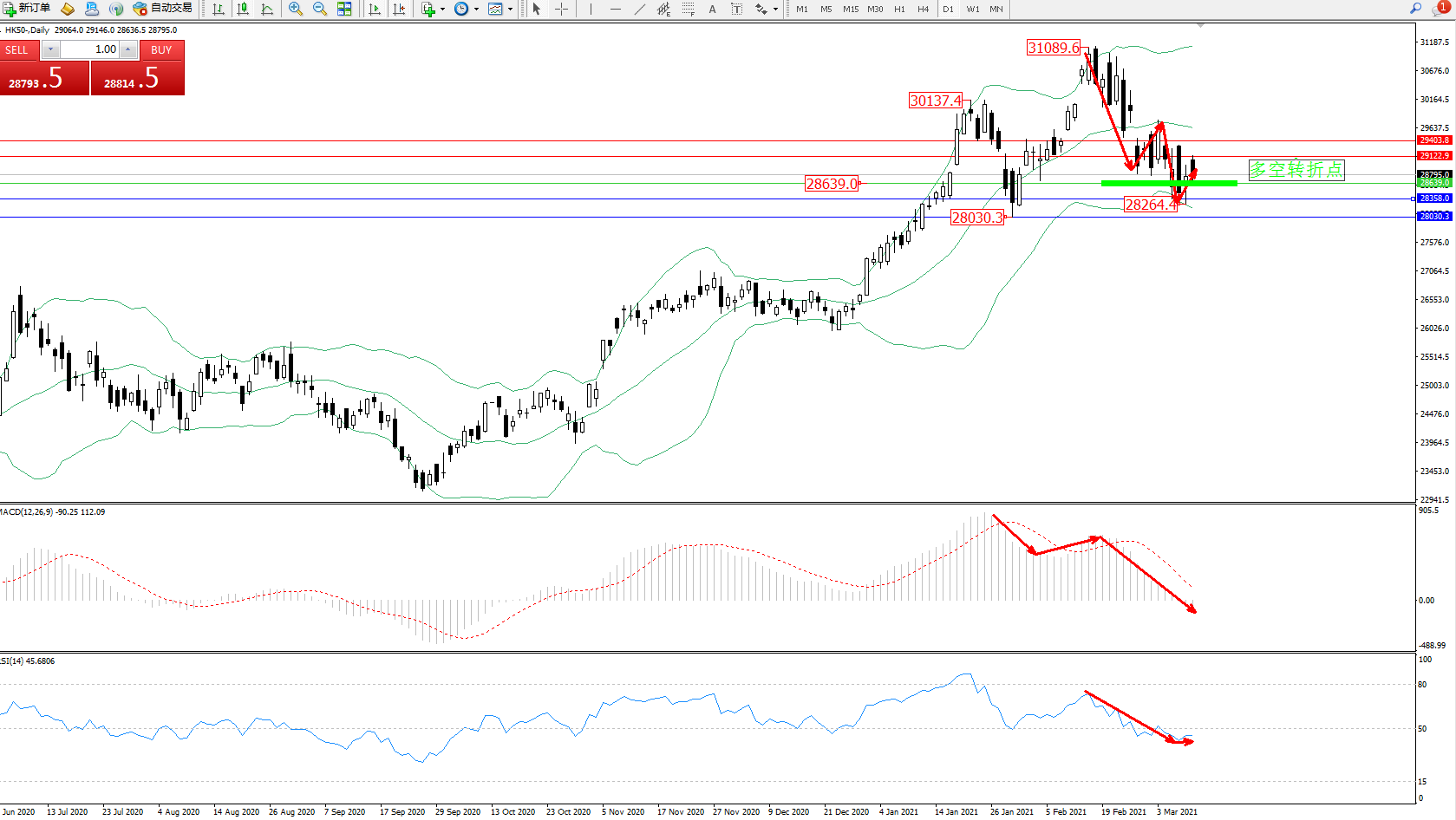 技术点评:高位空头动力维持震荡下行,触及布林带指标下轨28264附近节点附近得到短暂支撑,多头动力伺机入场,纠结于中下轨区间持续震荡走势中,布林带指标呈张口走势持续中,短期或将维持整理态势,MACD指标多头区域维持震荡下行走势纠结于0轴线下方维持弱势整理,RSI指标处于50均衡线下侧弱势徘徊中;