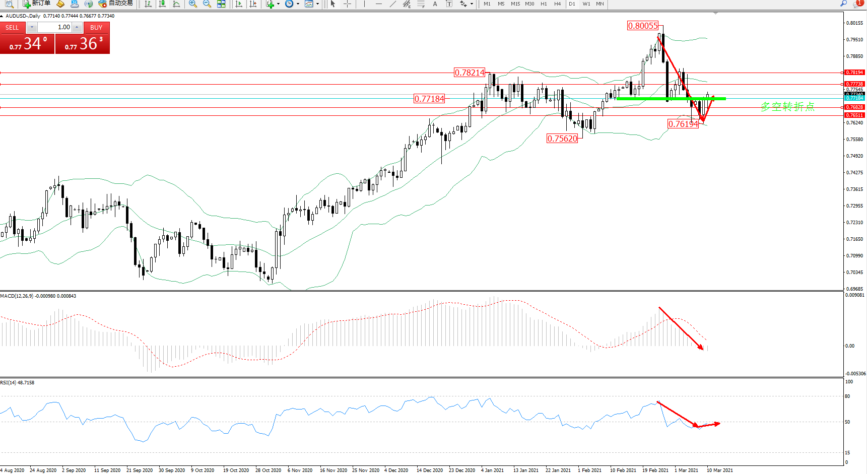 备选策略:0.77184下方看跌,目标0.76828、0.76511
