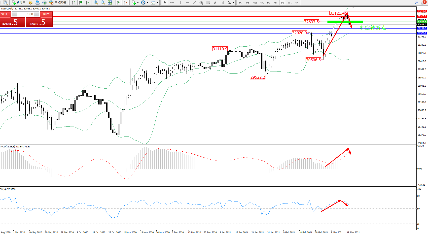技术点评:多头动力延续布林带指标通道上轨附近持续震荡上扬,高位抵达33121位置后震荡回撤,短期或维持短暂下行走势,布林带指标呈张口走势后开始有收口迹象,MACD指标多头动力持续震荡上扬后高位整理有回撤迹象,RSI指标处于多头区域整理后开始反转向下移动;