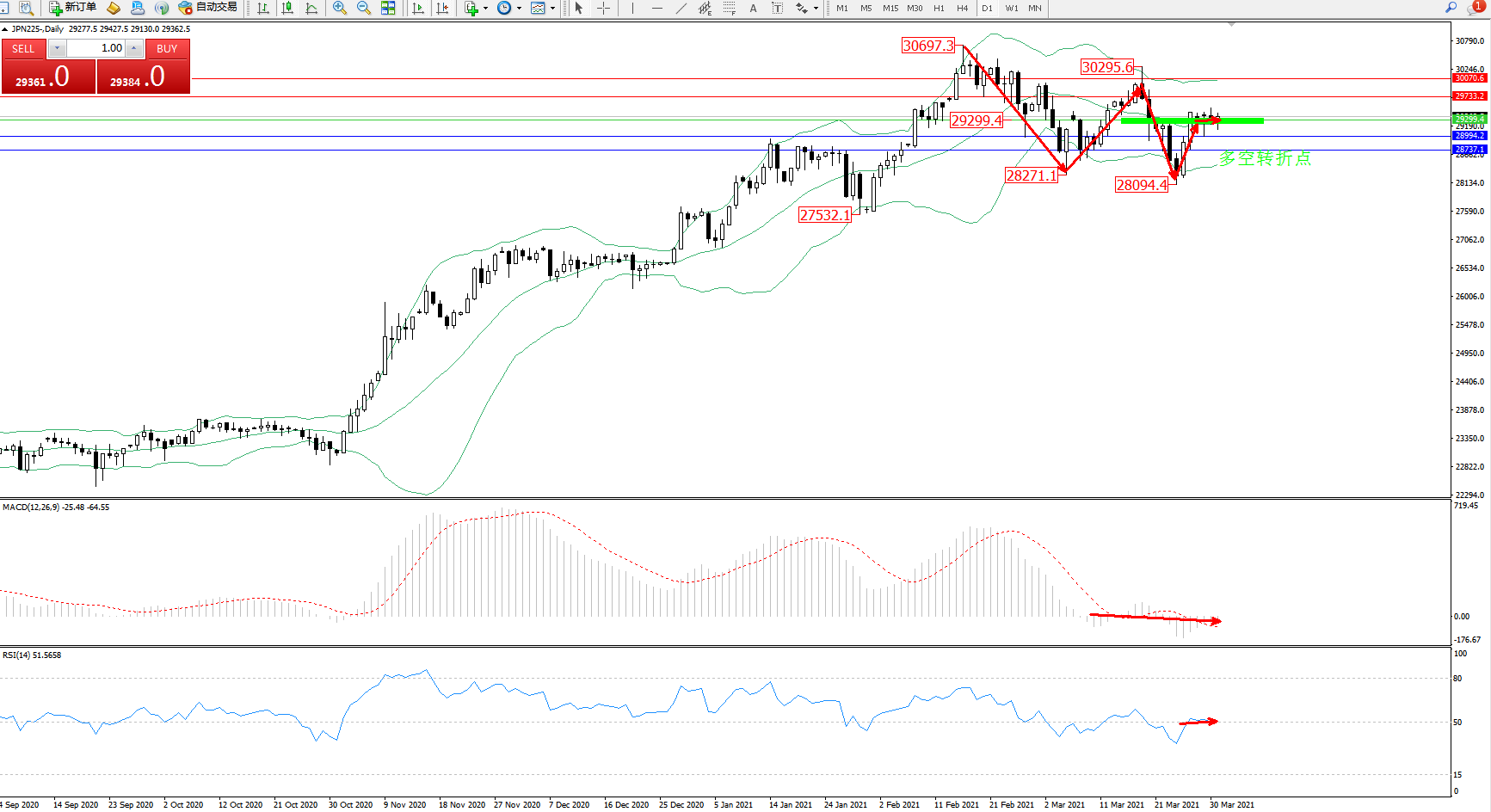 技术点评:高位空头动力维持在布林带指标通道宽幅震荡向下移动,低位抵达28094位置节点后得到支撑开始反转上移,突破中轨后开始维持弱势整理平移,关注中轨附近节点,MADC指标空头动力下行后长时间纠结于0轴线附近长时间维持震荡,RSI指标处于50均衡线附近弱势徘徊;