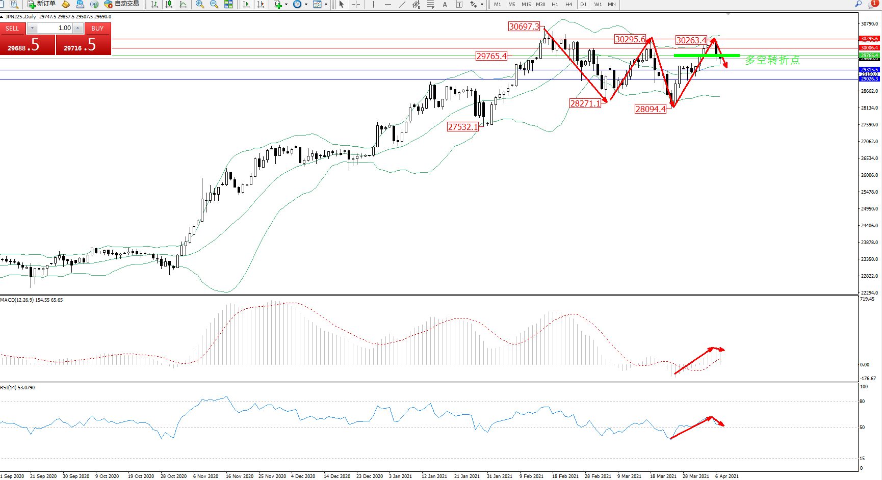 日经225指数4月7日(周三)收盘上涨40.37点,涨幅0.14%,报29737.00点。日本经济再生大臣西村康稔6日接受共同社专访时透露,考虑引入新冠疫情恶化达到一定条件就自动强化对策的“熔断”机制。日本政府将设置显示紧急度的新指标,作为迅速采取要求餐饮店缩短营业时间等措施的依据,具体内容将在新冠感染症对策小组会听取专家意见讨论。多名相关人士称,新指标可能会将“年轻人病例数”作为新的监控对象。这是因为在疫情的初期阶段,感染者中年轻人占比有上升趋势。