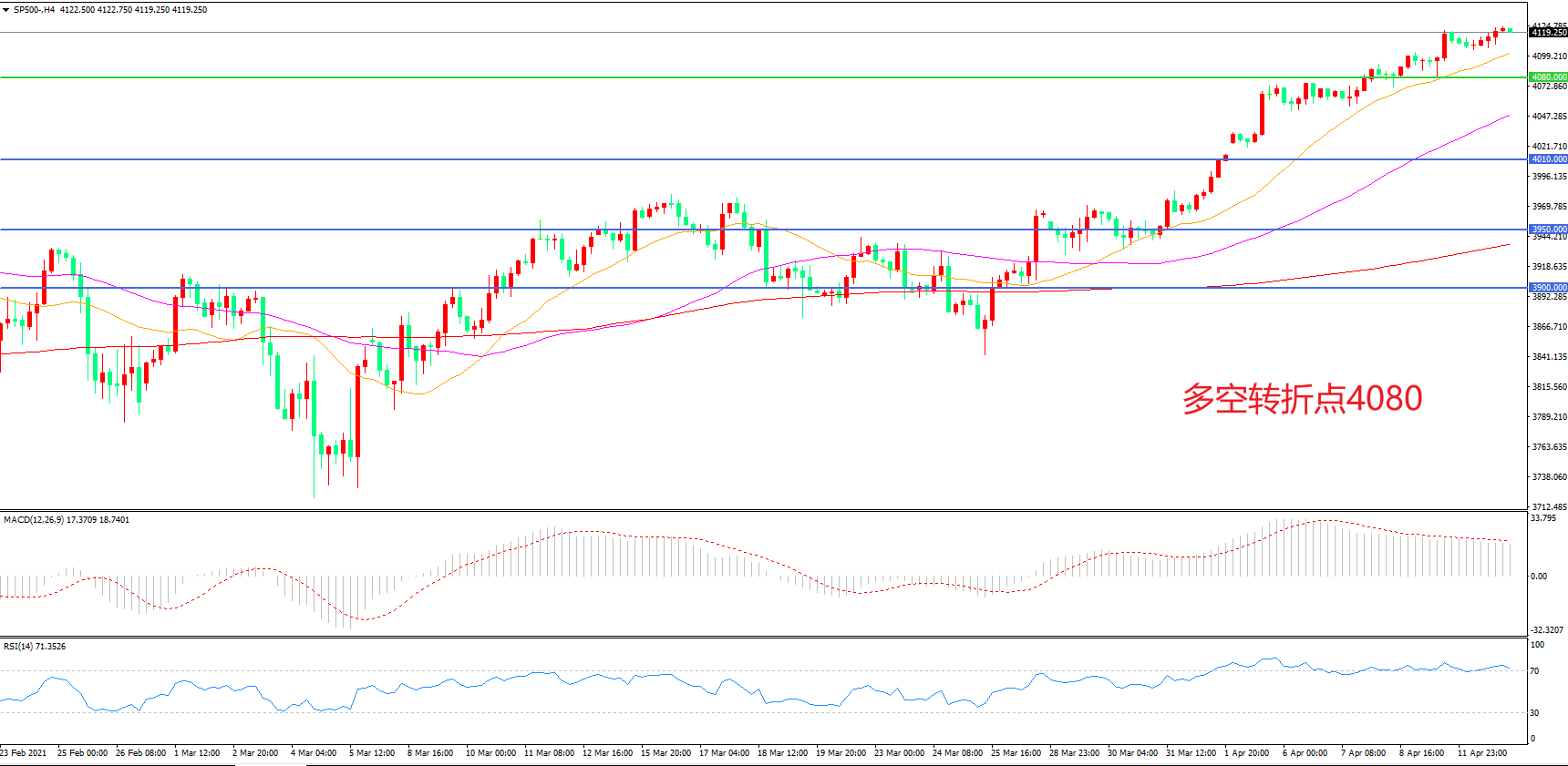 周一(4月12日),美联储主席鲍威尔发表迄今为止“最乐观”表态,他认为夏季几个月的任何通胀上升都将是暂时的,与目前的货币政策无关,只有通胀在一段时间内保持温和超过2%,才会考虑加息,市场风险情绪受到提振,标普500延续震荡上行,收报4121点。目前市场高度期待高盛和摩根大通等美国最大型银行的一季报以及美国国债拍卖的情况,交投较为清淡。
