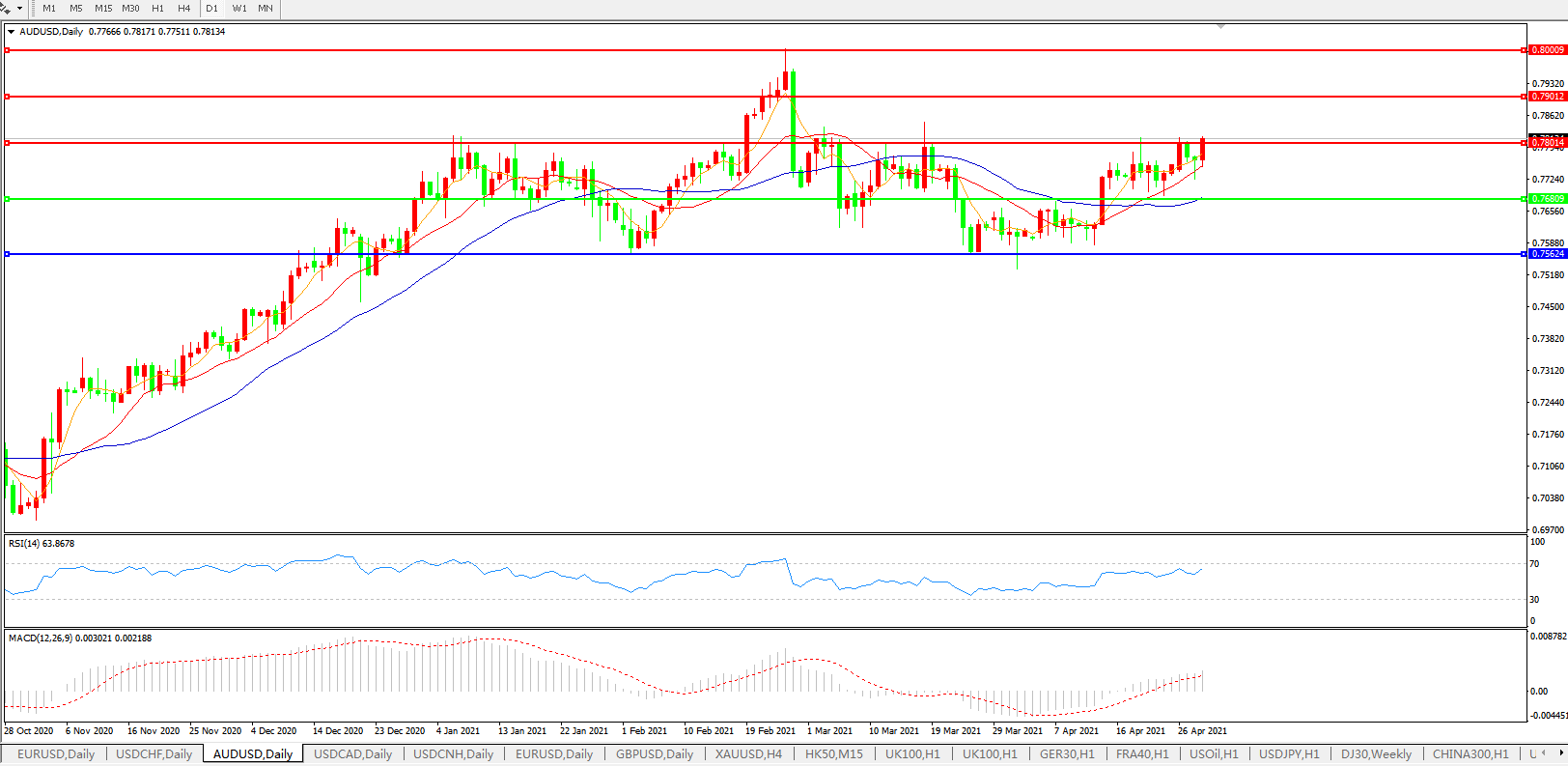 交易策略:0.7680上方看涨,目标0.7800、0.7900