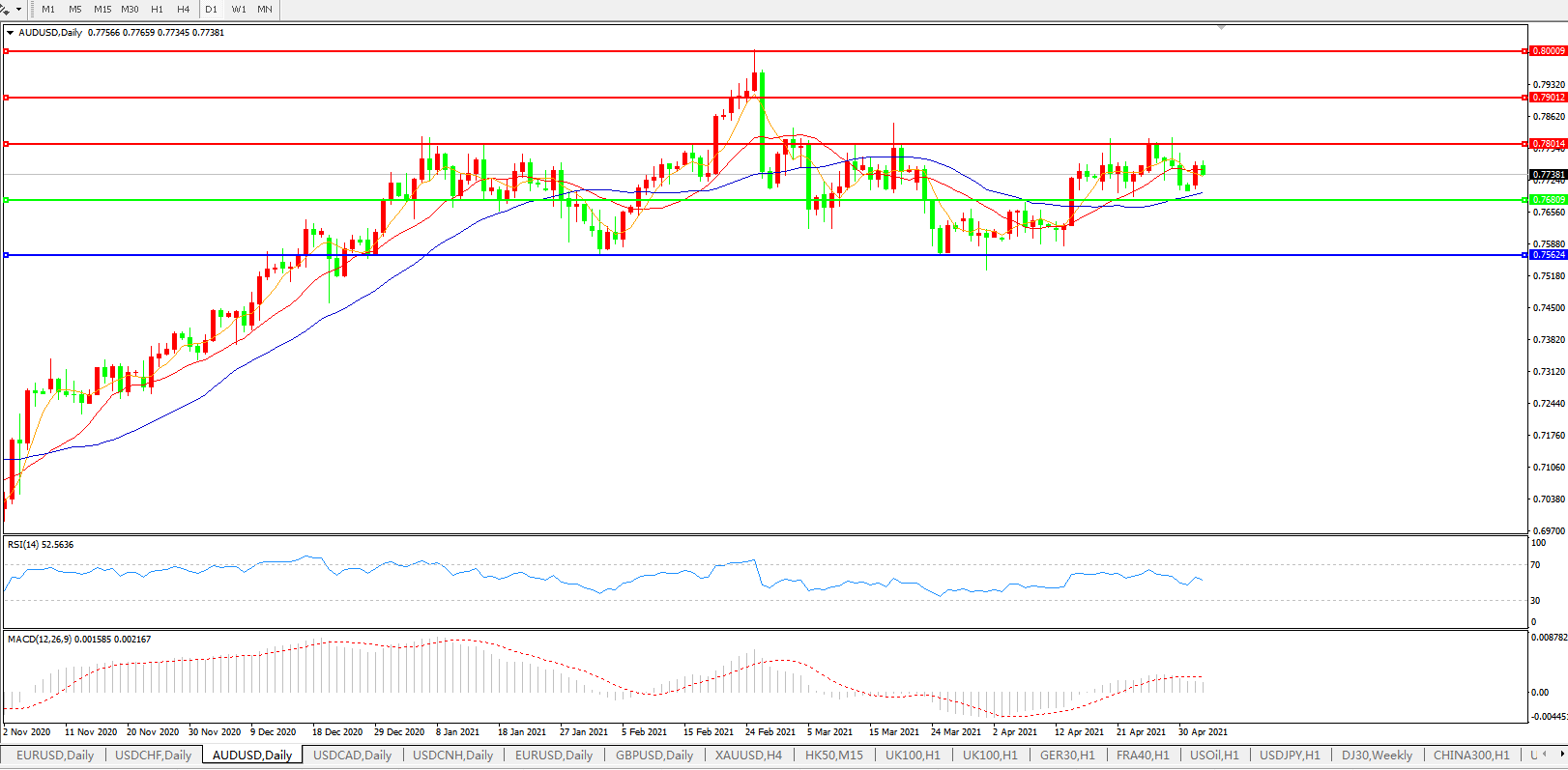 备选策略:0.7680下方看跌,目标0.7560、0.7400