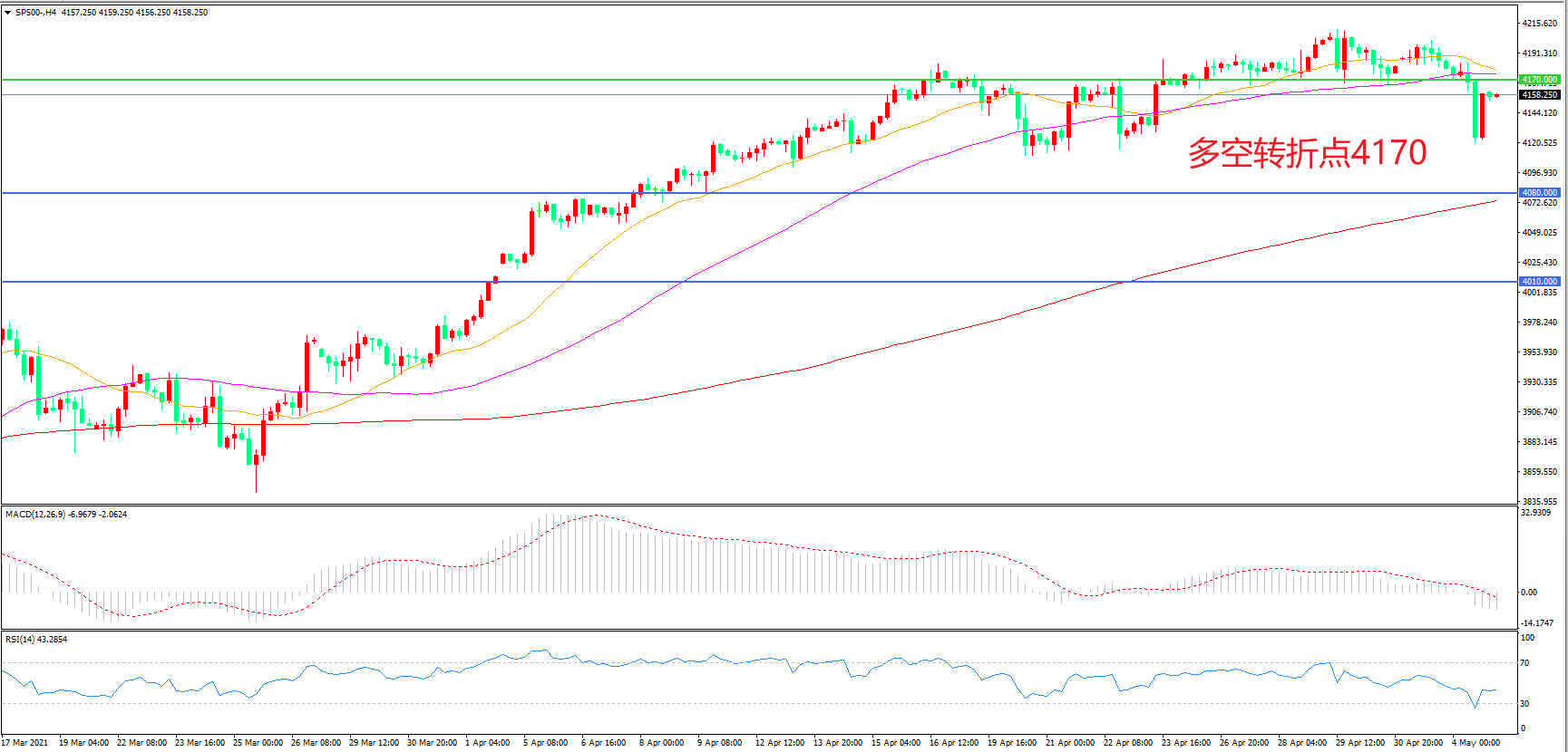 目前美国三大股指屡创新高、在财报季再难有惊喜、经济复苏与财报已被计价的情况下,市场担心通胀和加息预期有可能引发美股回调。本周五美国将公布非农报告,在3月份增加了91.6万个工作岗位之后,市场预测4月新增就业人数可能达到100万。如果这次非农报告非常火爆,市场对美联储缩减购债的预期时间可能会提前。