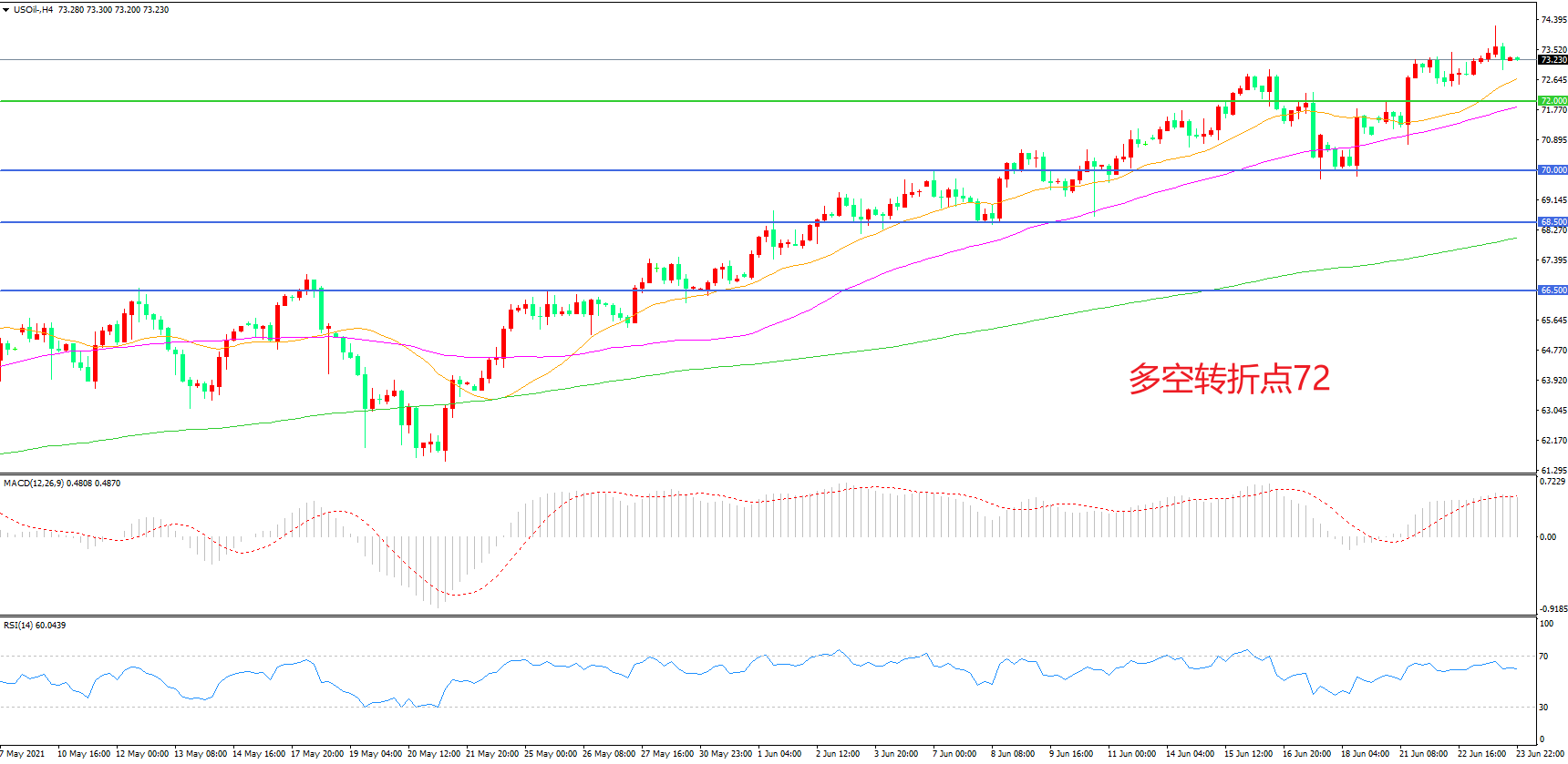 4小时图看,油价突破72美元阻力后再度上行,短期表现强势,均线系统成为下方支撑,MACD红柱增加,RSI指标走平,日内震荡上行概率较大。
