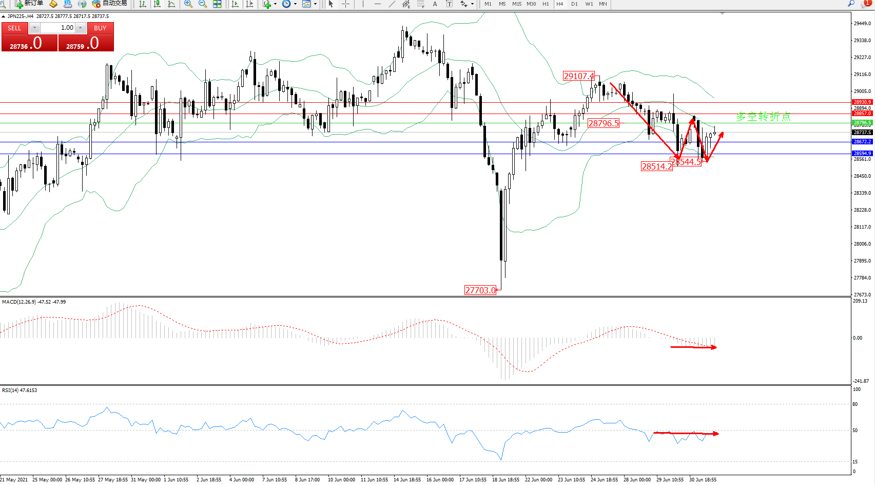 交易策略:28796下方看跌,目标28672、28594