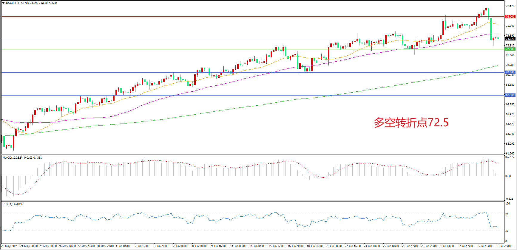 交易策略:在72.50之上看涨,目标75.00    78.00
