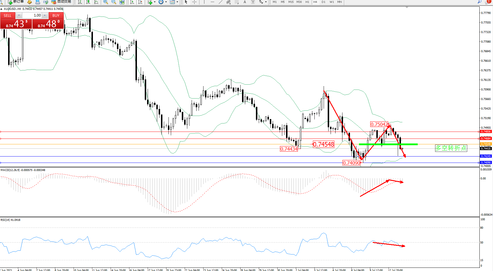 交易策略:0.74548下方看跌,目标0.74245、0.74090